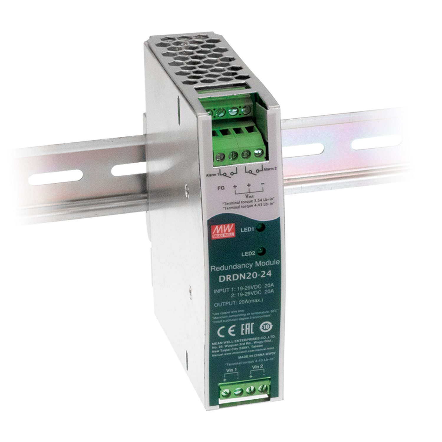 20A DIN rail Redundancy Module to improve overall system operation reliability; Support 1+1 and N+1 redundancy system; 2 channels input and 1 output; DC OK; Input 12Vdc